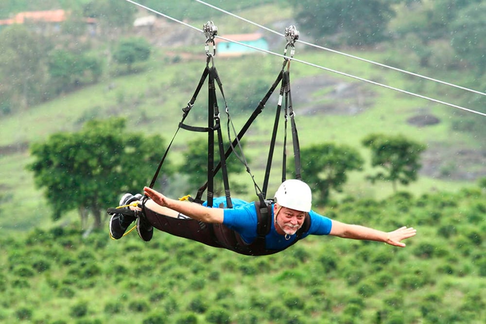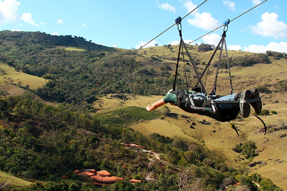 A vista é muito boa, porém as tirolesas sentadas permitem maior campo de visão. Mas também é emocionante, e o condutor muito bem preparado e atencioso
